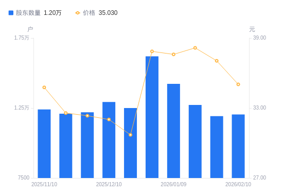 2月11日消息,数据显示,截至2026年2月10日,唯万密封A股股东总户数为1.2万户,较上期(2026年1月30日)增加120户,增幅1.01%。公司最新A股总股本为1.2亿股,其中流通A股7719.82万股,户均持有流通A股数量为6411.28股,较上期减少64.54股,降幅1.00%;户均持流通A股市值22.46万元,较上期减少1.53万元,降幅6.39%。